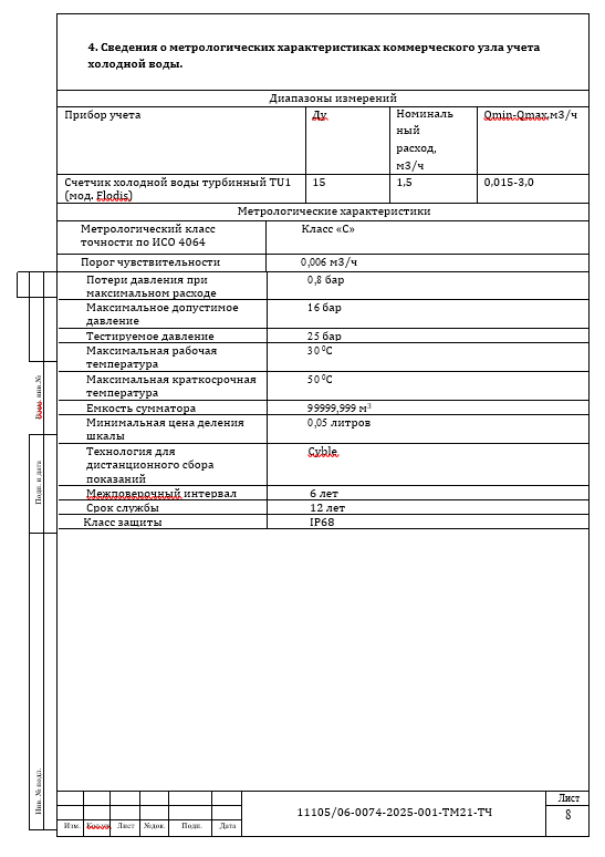г) Сведения о метрологических характеристиках узла коммерческого учета холодной воды.